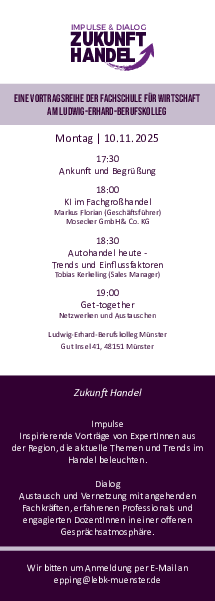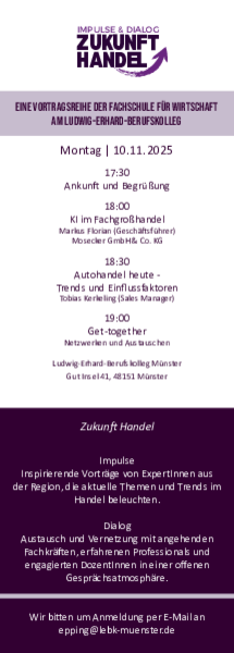 Mit der Vortragsreihe “Zukunft Handel” möchte die Fachschule den Blick in die Zukunft des Handels richten – praxisnah, regional verankert und im Dialog mit Expertinnen und Experten aus Wirtschaft und Wissenschaft.