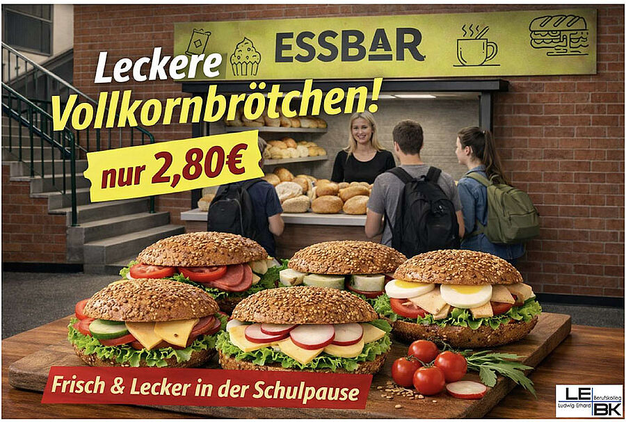 Fazit: Die BF2A hat nicht nur gezeigt, wie Werbung funktioniert, sondern auch bewiesen, dass Teamarbeit, Kreativität und ein gutes Vollkornbrötchen einfach zusammengehören. Wer jetzt in der Pause am Kiosk vorbeischaut, weiß: Diese Werbung kommt direkt aus der Klasse – und macht richtig Appetit!