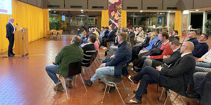 Tobias Kerkeling, selbst Absolvent der Fachschule, ordnete in seinem Vortrag die aktuelle Situation des Automobilhandels in die Megatrends der Gesellschaft ein und gewährte spannende Einblicke in die Branche. Mit seiner pointierten Aussage „Wenn es der deutschen Autoindustrie schlecht geht, geht es dem Handel gut.“ sorgte er für Aufmerksamkeit im Publikum.